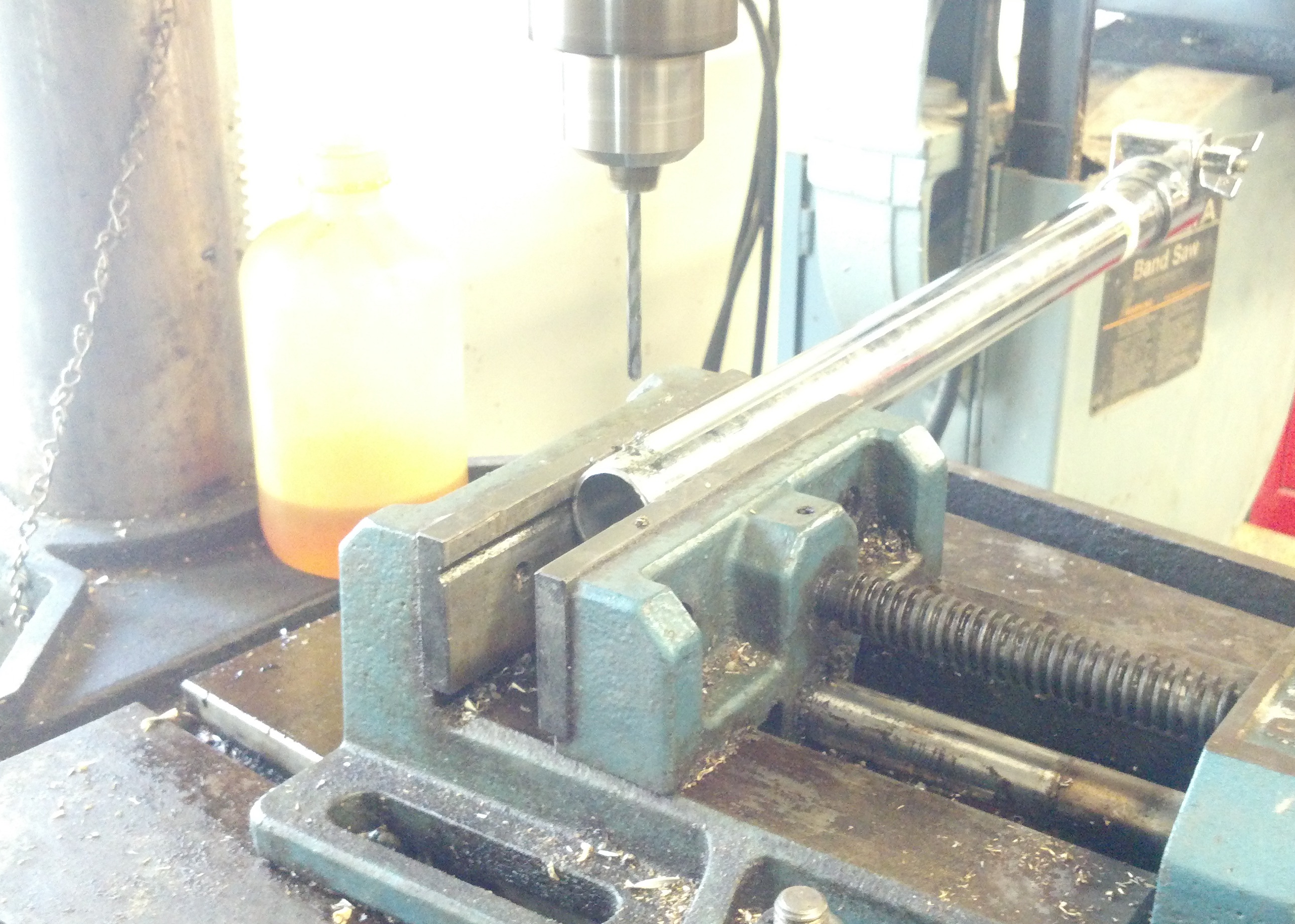 Then mount the pipe in the drill press to drill the necessary mounting holes for the bottom-brace of the legs.