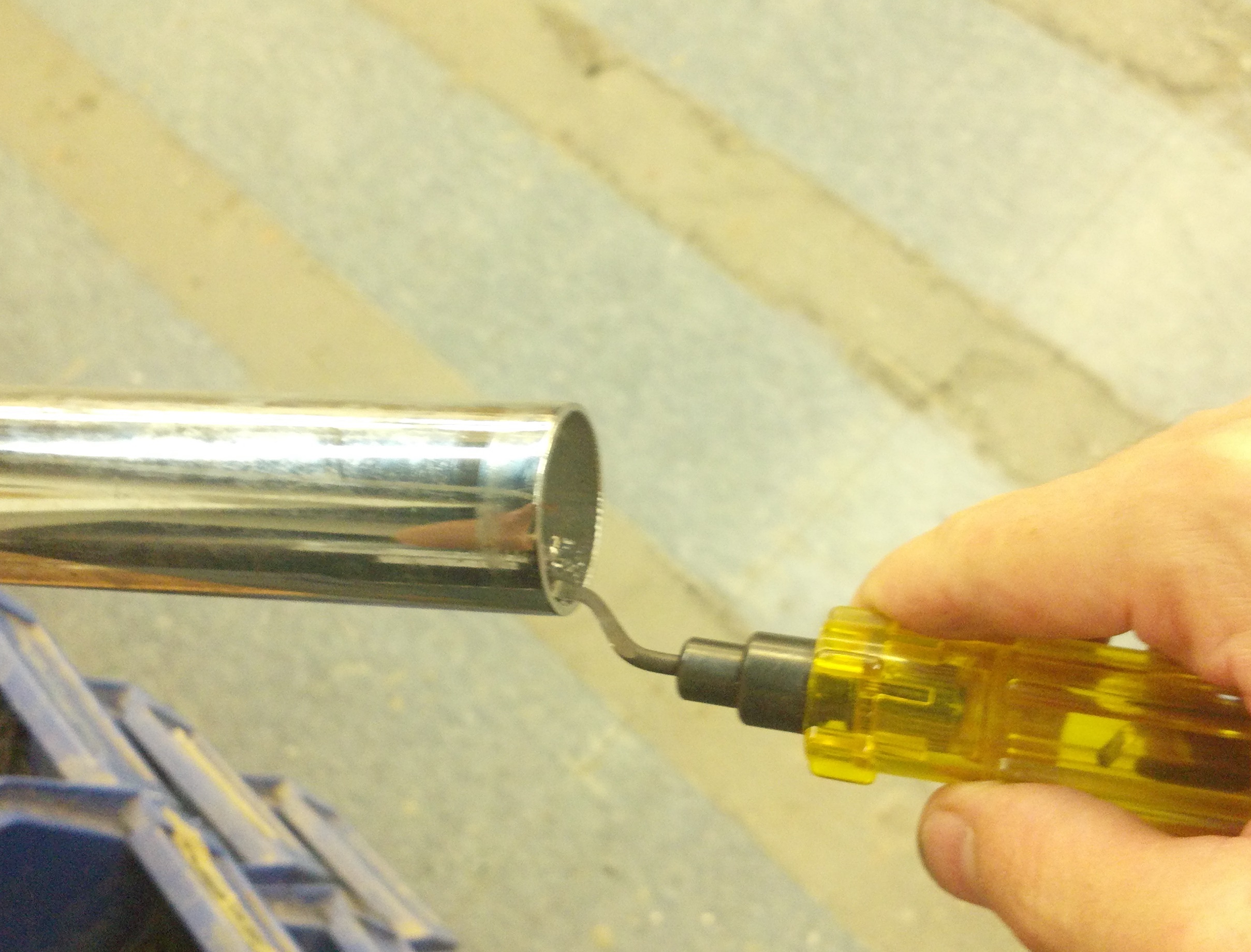 …and, for good measure, some additional de-burring on the bottom of the tripod-pipe once we re-assemble. I almost learned the hard way that the last place and time I want to cut my hand is during load-in to a show.
